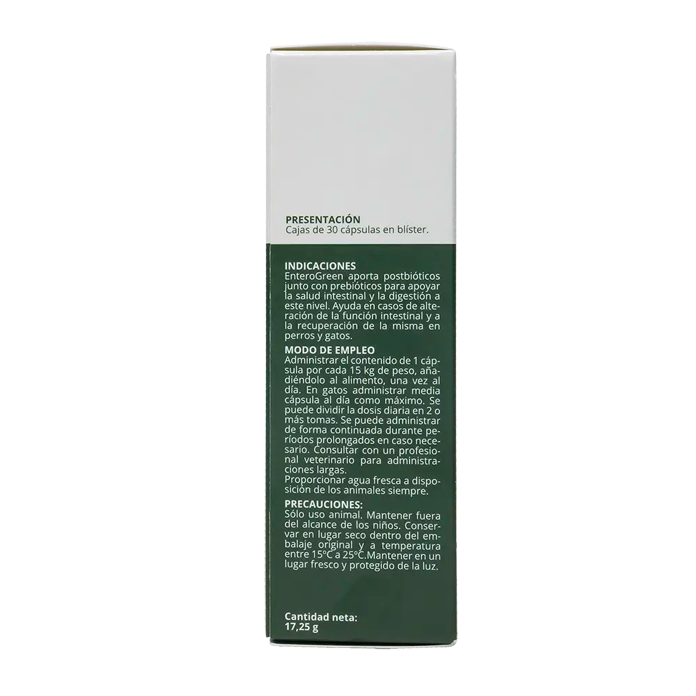 - Modo de empleo: Administrar el contenido de 1 cápsula por cada 15 kg de peso, añadiéndolo al alimento, una vez al día, durante el tiempo necesario hasta normalizar la alteración intestinal. En gatos se recomienda emplear media cápsula al día como máximo, o administrar esta dosis a días alternos.