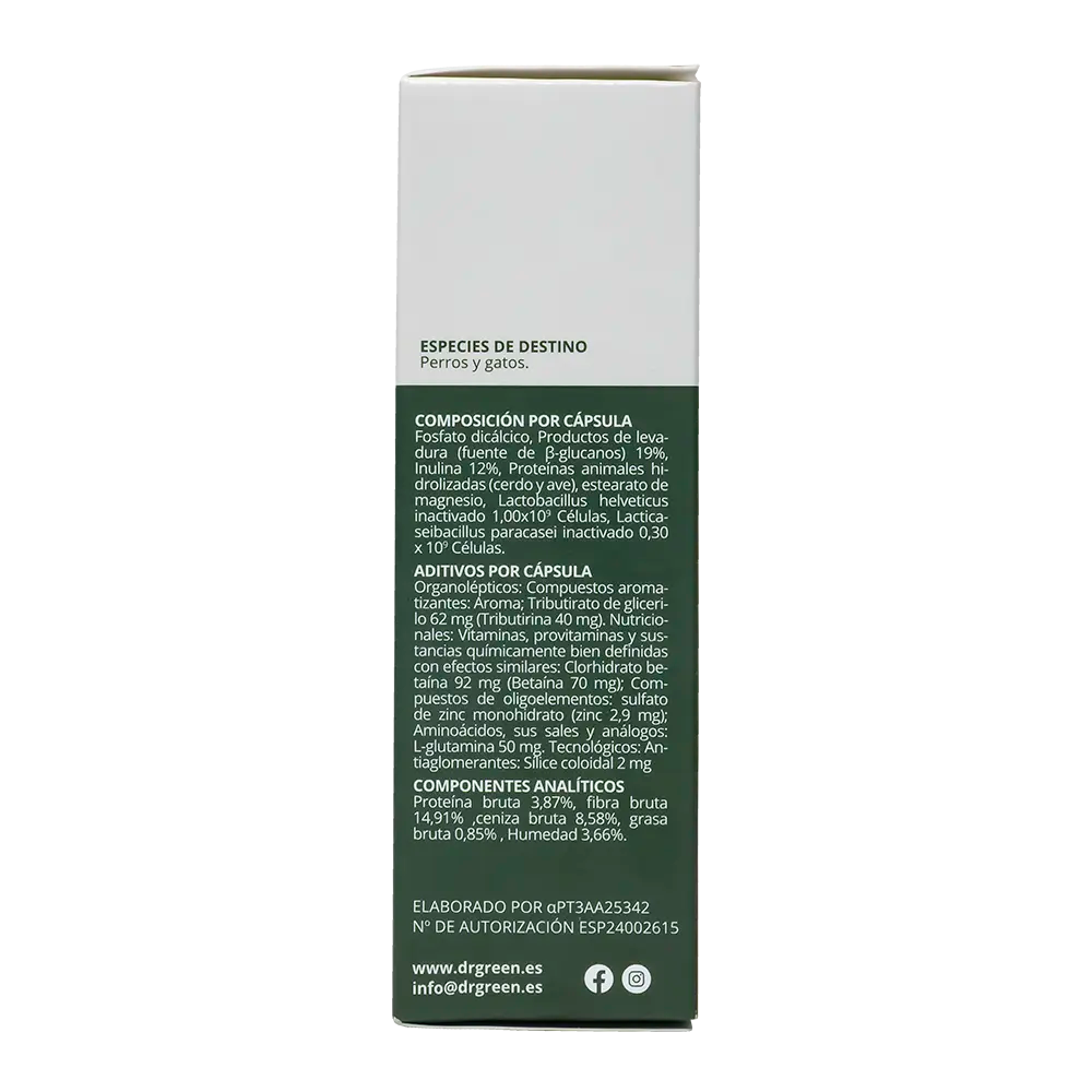 - Lactobacillus helveticus inactivado y Lacticaseibacillus paracasei inactivado: Como postbióticos: los postbióticos son bacterias probióticas inactivadas, partes de ellas o sus metabolitos y que presentan varios beneficios en la salud intestinal, ayudan a la estabilización de la flora, la reducción de la inflamación a este nivel y mejoran el sistema inmunológico general de perros y gatos.
