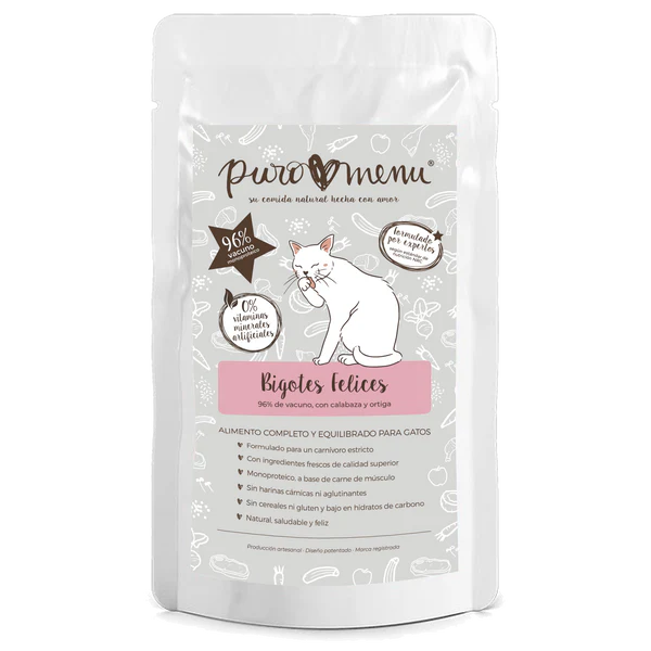 Menú cocinado "Bigotes Felices BIO": alimento ecológico cocido, completo y equilibrado para gatos y gatitos de cualquier raza.