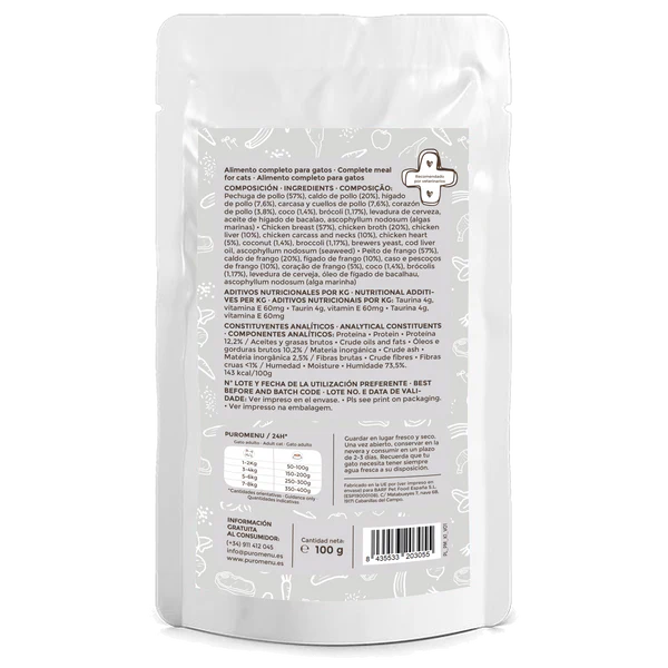 Composición: Pechuga de pollo (57%)*, caldo de pollo (20%)*, hígado de pollo (7,6%)*, carcasa y cuellos de pollo (7,6%)*, corazón de pollo (3,8%)*, coco (1,4%)*, brócoli (1,17%)*, levadura de cerveza, aceite de hígado de bacalao, ascophyllum nodosum (algas marinas)*